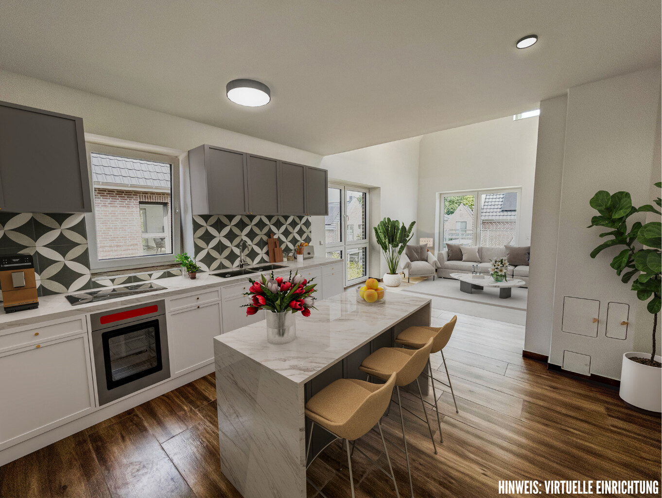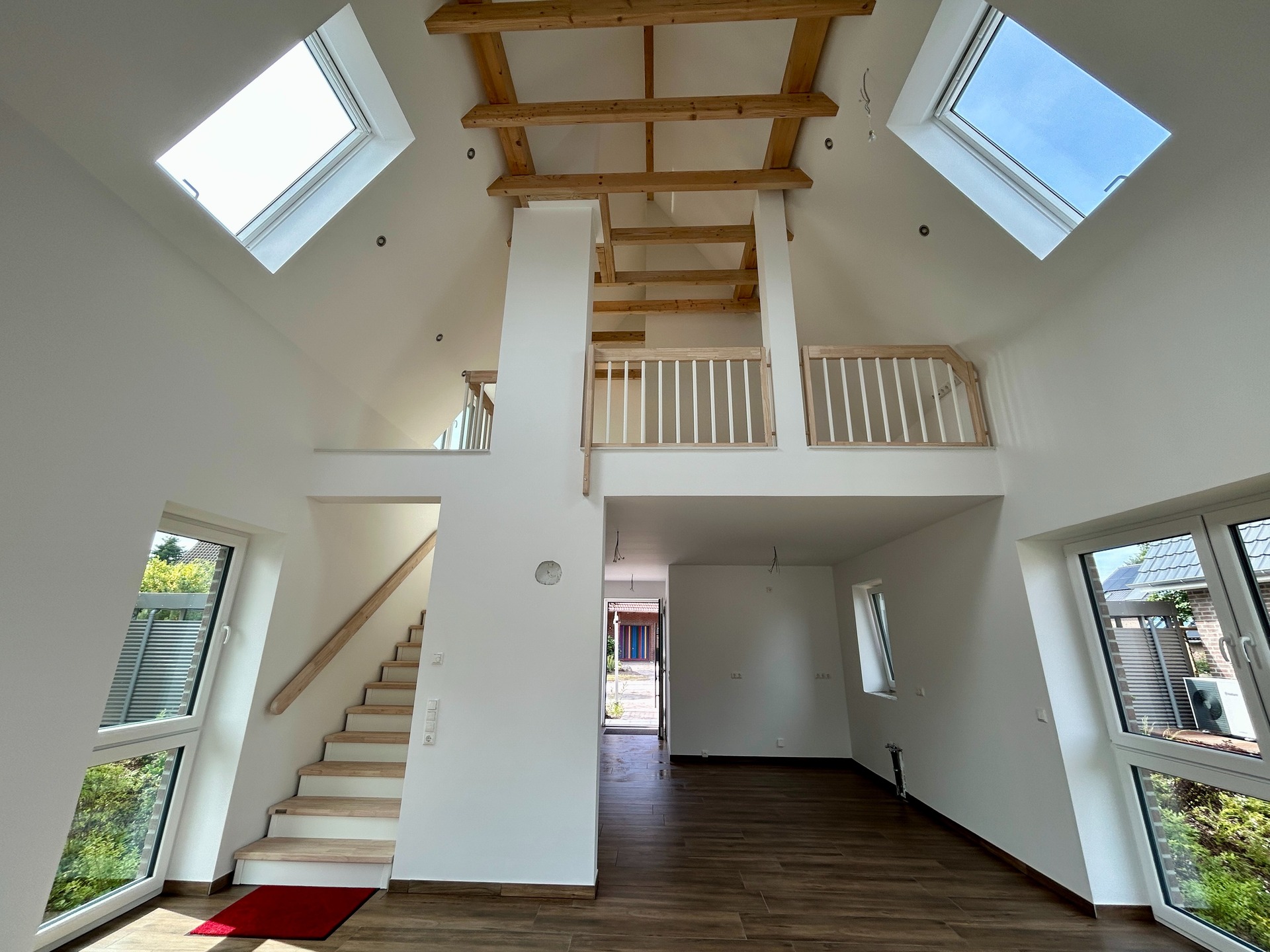 Im offenen Wohn,- Koch- und Essbereich des Erdgeschosses erwartet Sie ein besonderes Raumgefühl durch die großen Fensterfronten und den Luftraum mit Blick bis unters Dach.