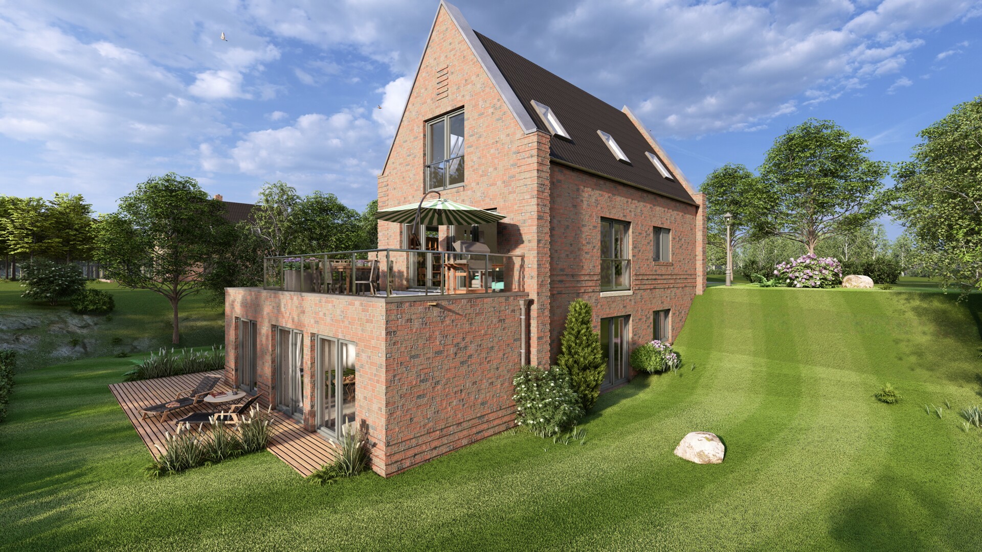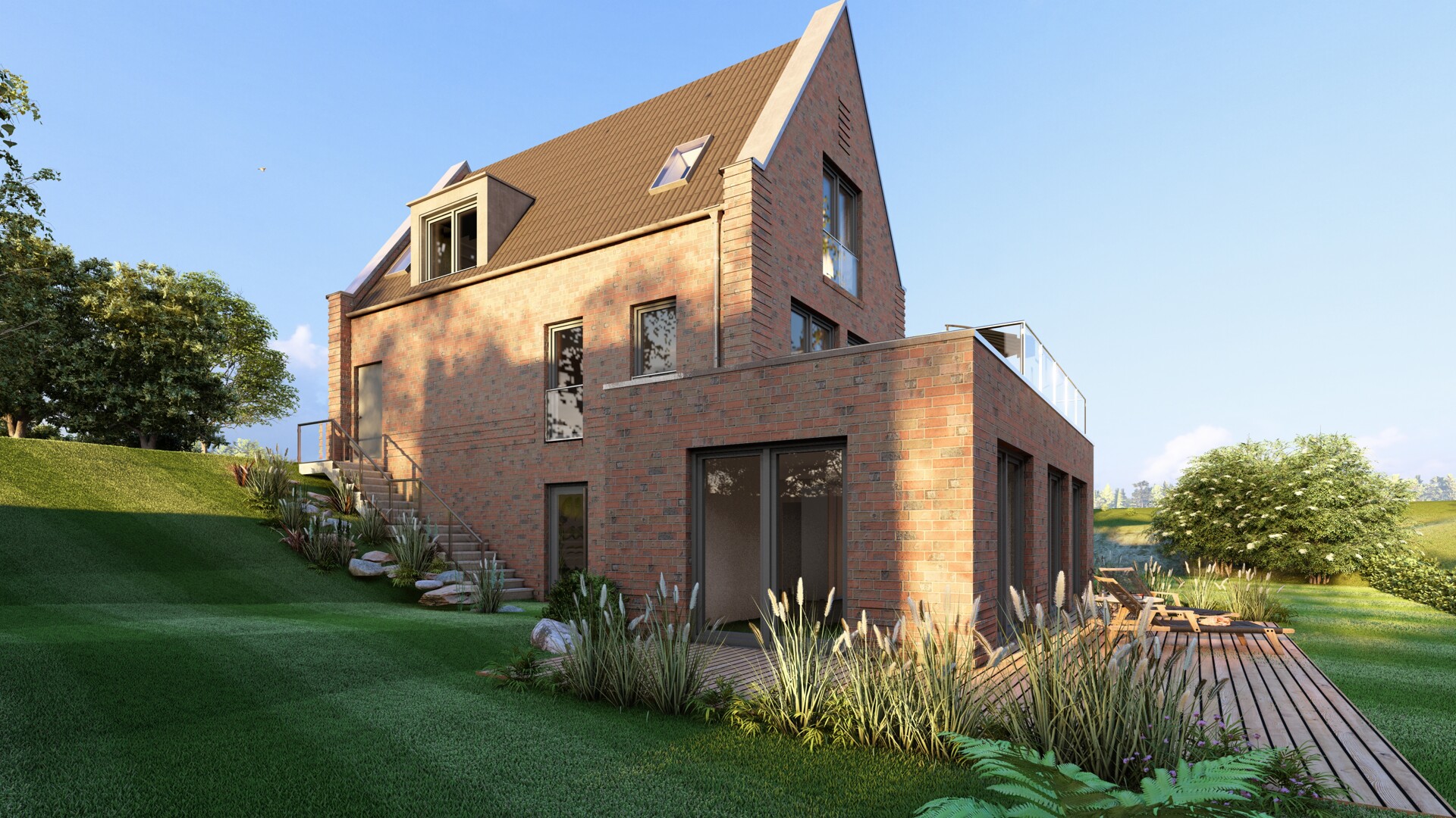 Große Fensterflächen sorgen für helle, freundliche Wohnräume und schaffen eine angenehme Verbindung zwischen Innen- und Außenbereich. Die Terrasse, sowie eine großzügige Dachterrasse bieten vielfältige Möglichkeiten zum Entspannen im Freien und unterstreichen den hohen Wohn- und Erholungswert dieser Immobilie.