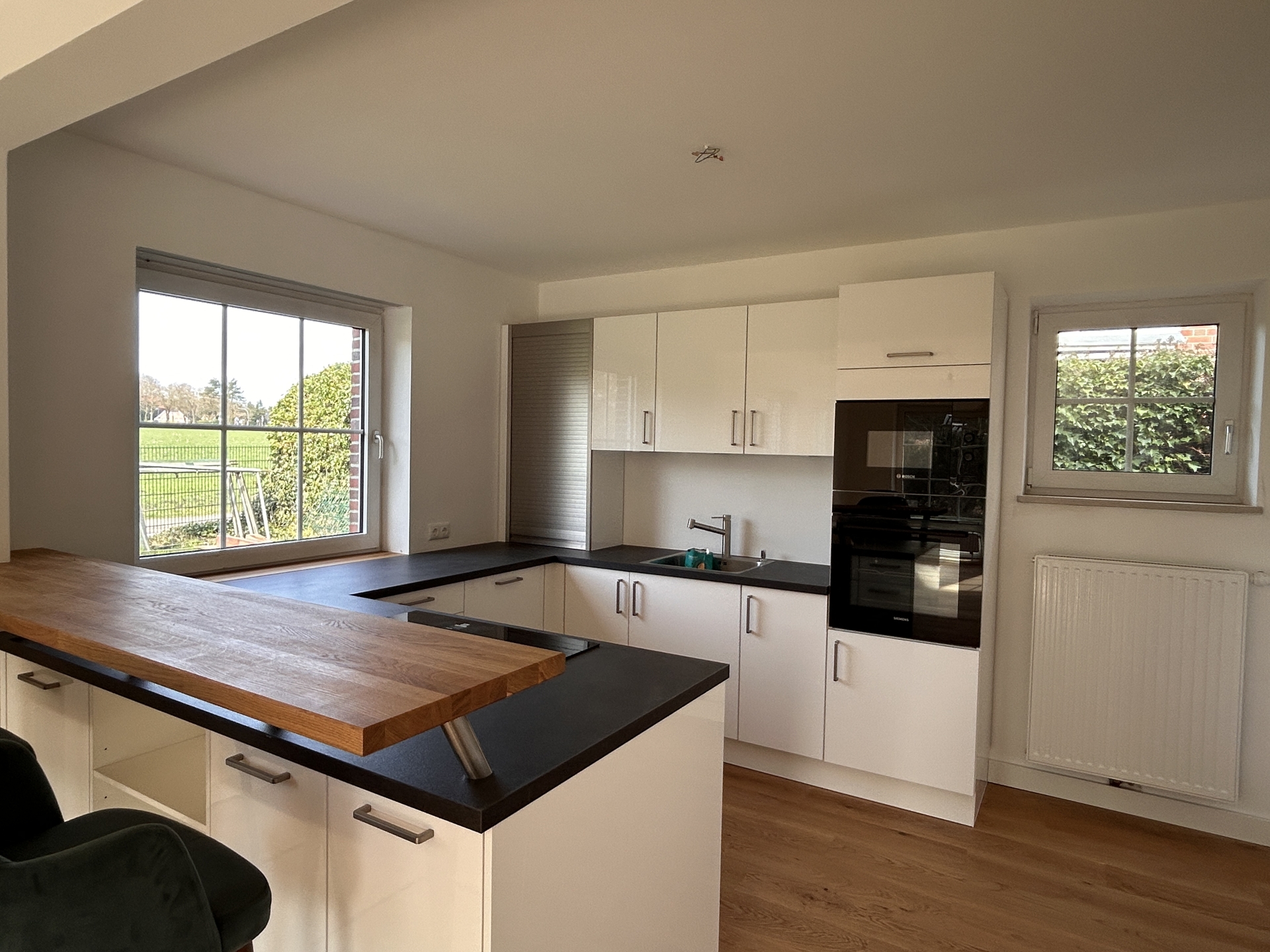 Der Wohn- und Essbereich mit integrierter, offener Einbauküche bildet das Herzstück der Wohnung und schafft eine einladende Atmosphäre.