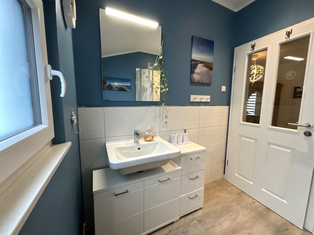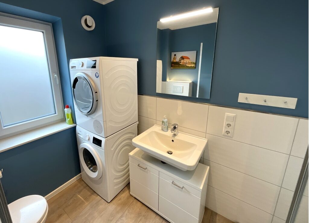 Für Komfort im Alltag stehen Ihnen 3 Badezimmer mit insgesamt 3 bodengleichen Duschen zur Verfügung; zusätzlich gibt es ein Gäste-WC. Auch für längere Aufenthalte ist das Haus praktisch ausgestattet: Waschmaschine und Trockner sowie Bügeleisen, Bügelbrett, Wäscheständer und Staubsauger erleichtern die Organisation.