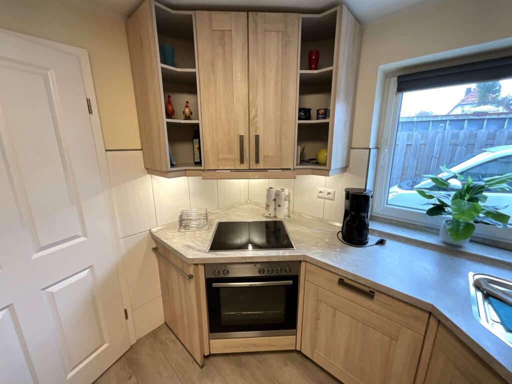 Küche und Haushalt: Einbauküche, Kühlschrank mit Gefrierfach, 4-Zonen Cerankochfeld, Backofen, Mikrowelle, Dunstabzugshaube, Geschirrspüler, Toaster, Wasserkocher, Kaffeefiltermaschine, Senseo Padmaschine, hochwertiges Geschirr und Besteck