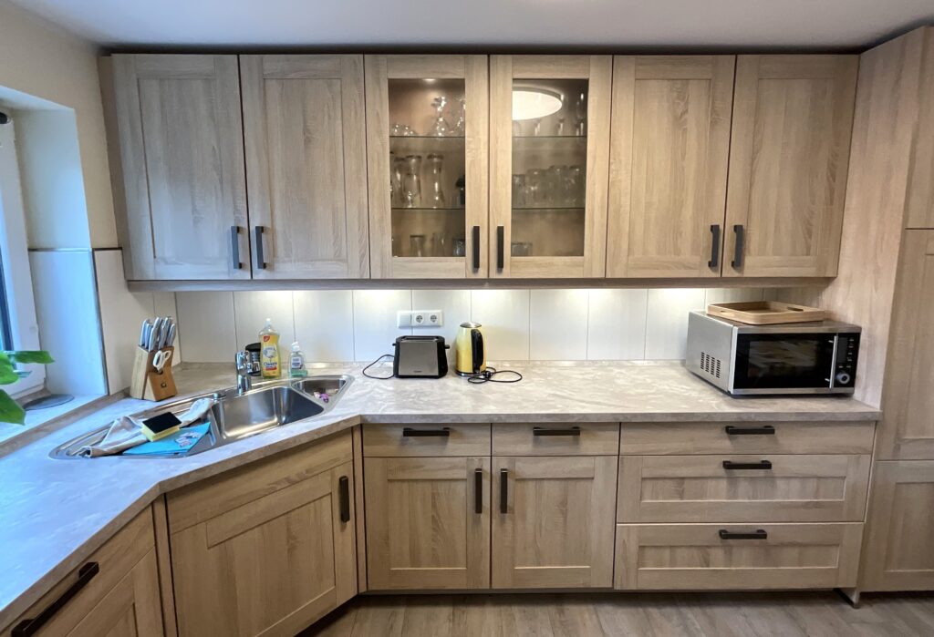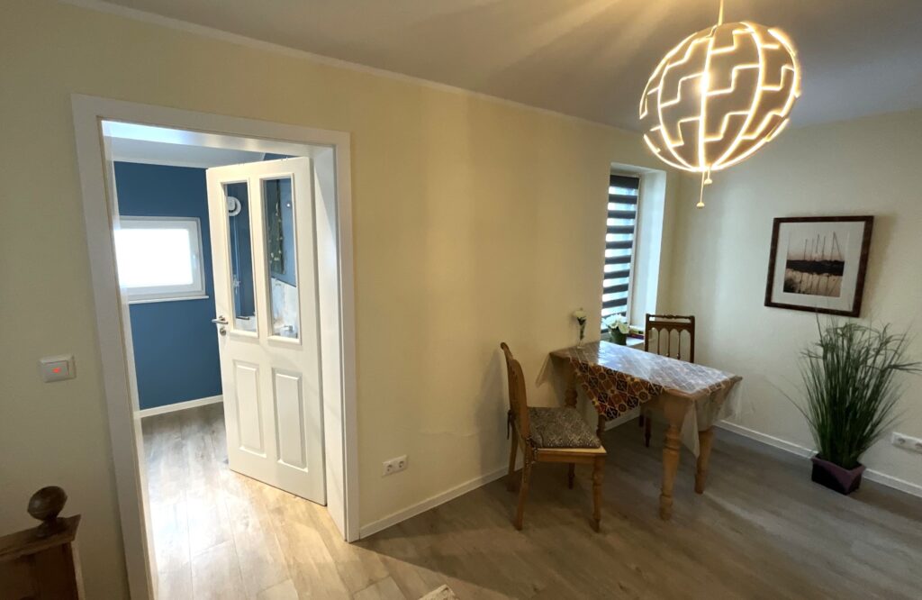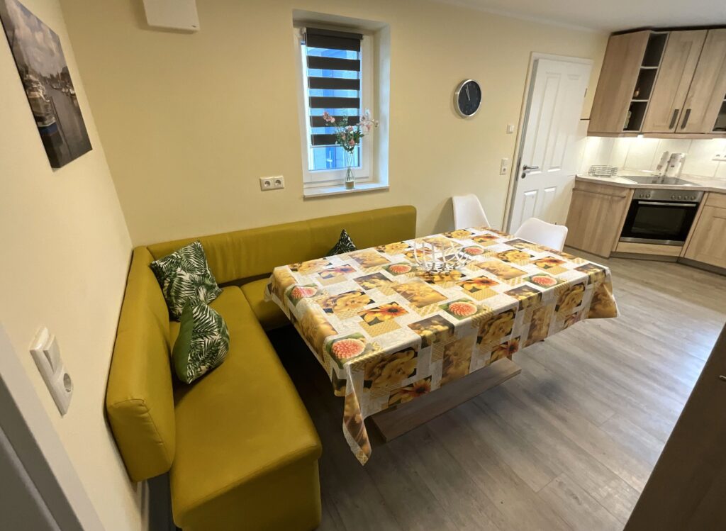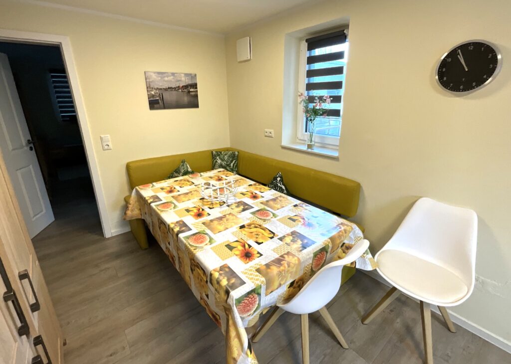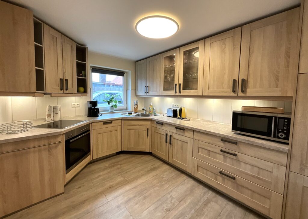 Die geschlossene Küche ist separat gehalten und mit Esstisch ausgestattet – passend für gemeinsames Kochen und entspannte Mahlzeiten. Zur Ausstattung gehören Ceran-Herd, Backofen (Elektro), Mikrowelle, Kühlschrank, Spülmaschine, Kaffeemaschine, Wasserkocher, Toaster sowie Küchenutensilien, Geschirr und Besteck. Ein eigener Essbereich mit Esstisch ist ebenfalls vorhanden.