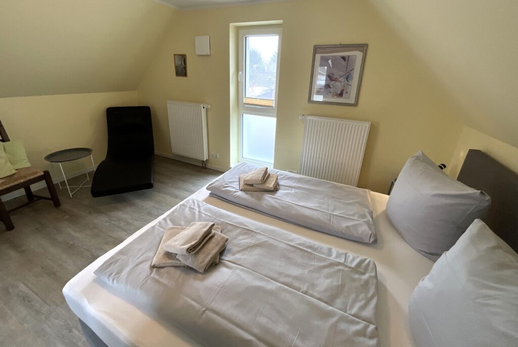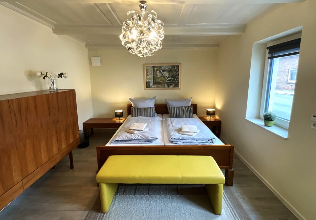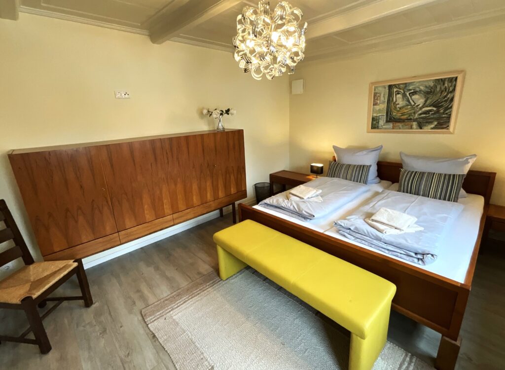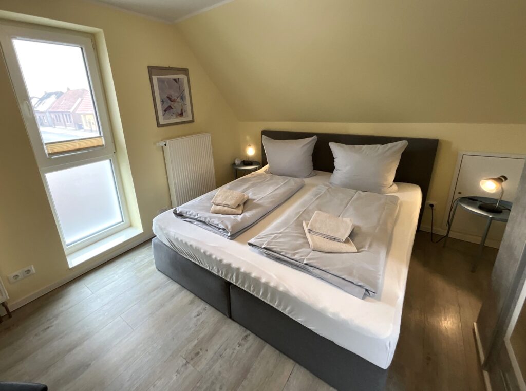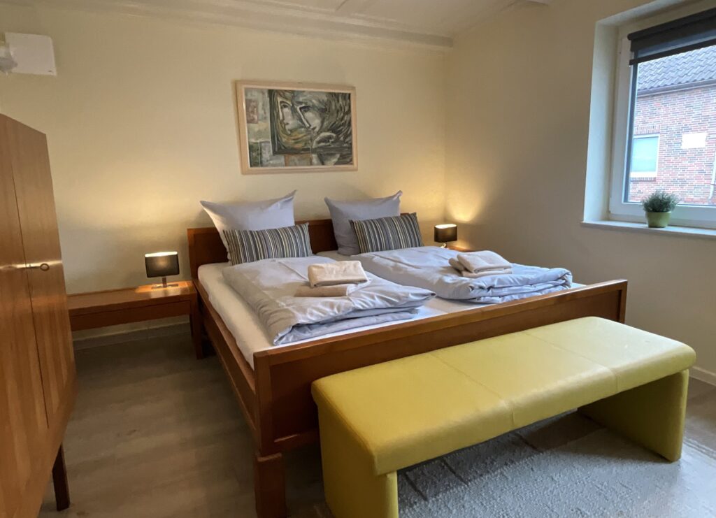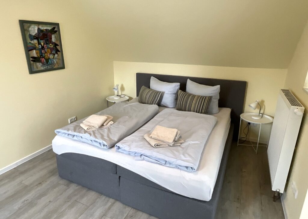Schlafzimmer 4 (1. Etage): Doppelbett (Maße: 180 x 200 cm) mit 1 durchgehenden Matratze 180x200 cm, Leselampe, Kleiderschrank, Bettwäsche auf Anfrage