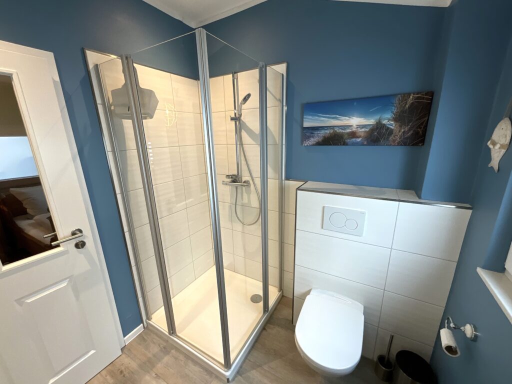 Bad 2: befindet sich im Erdgeschoss - angeschlossen an das kleine Schlafzimmer mit Dusche, Waschtischanlage mit Spiegel, WC