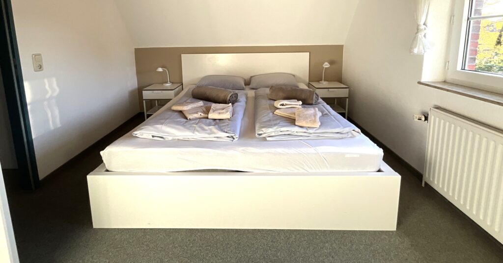 Schlafzimmer 1: 1 Doppelbett (2 Einzelmatratzen à 90x200 cm) , großer Kleiderschrank, Nachtische + Nachtischlampen, Verdunkelung durch Rolläden