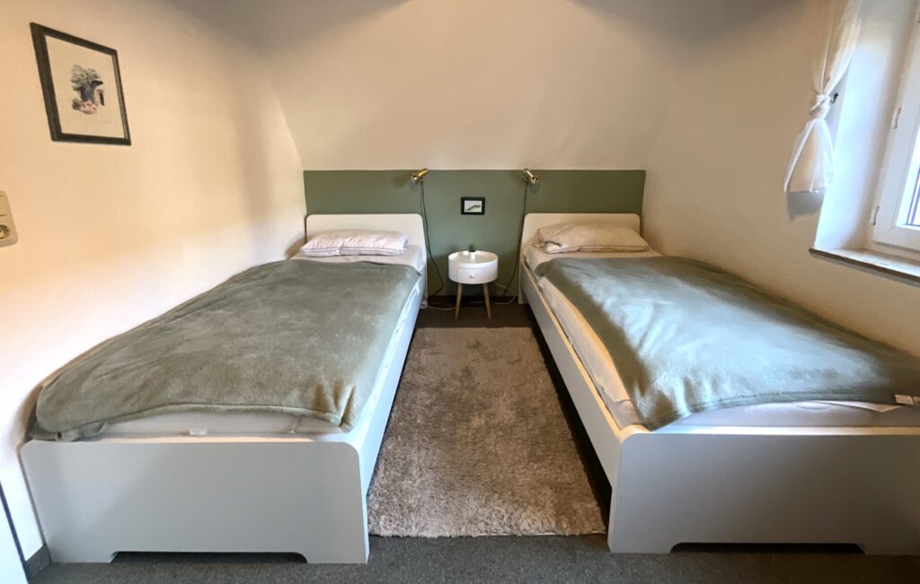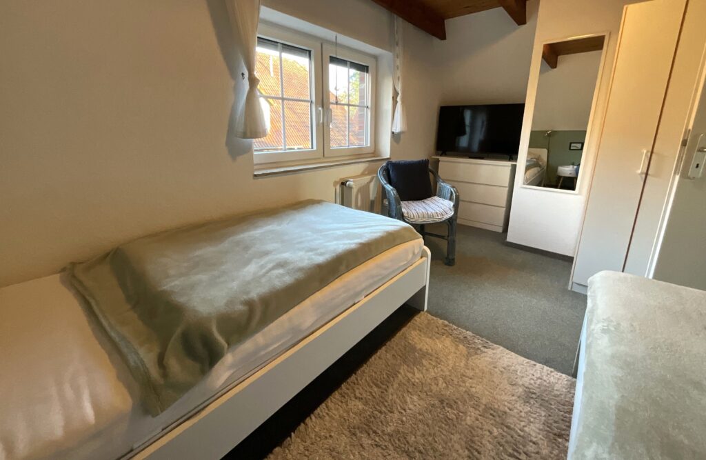 Schlafzimmer 2: 2 Einzelbetten (je 90x200 cm), großer Kleiderschrank, Nachtische + Nachtischlampen, Verdunkelung durch Rolläden, Fernseher