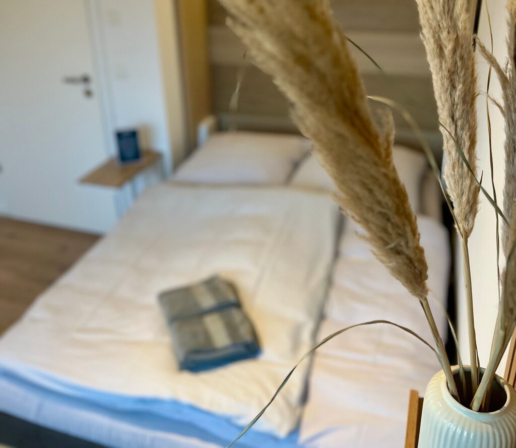 Mit insgesamt drei Zimmern, darunter zwei Schlafzimmer, bietet diese Unterkunft Platz für bis zu fünf Personen. Die Raumaufteilung eignet sich besonders für Familien, Paare oder kleine Reisegruppen. Im offenen Wohn- und Essbereich mit hochwertigem Parkettboden sorgt eine komfortable Sofaecke, mit Schlaffunktion, für ein behagliches Ambiente. Die bodentiefe, verglaste Fenstertür gewährt Zugang zu einem Balkon, wo Sie die salzhaltige Nordseeluft entspannt genießen können.